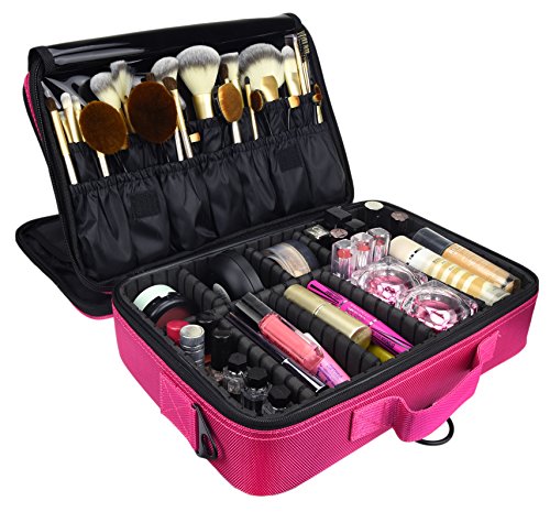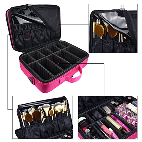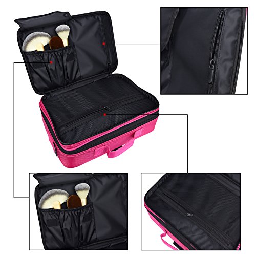 Goldwheat Travel Makeup Bag Cosmetic Train Case Beauty Box Brush Holder Multifunctional Backpack with Adjustable Dividers Pink-13.6"x4.3"x9.5"