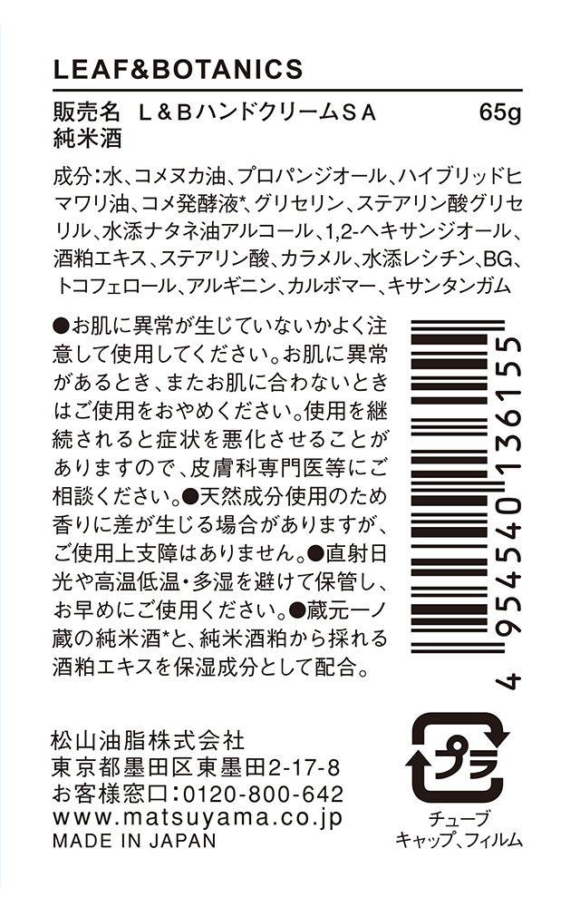 Leaf & Botanikusu hand cream pure rice sake