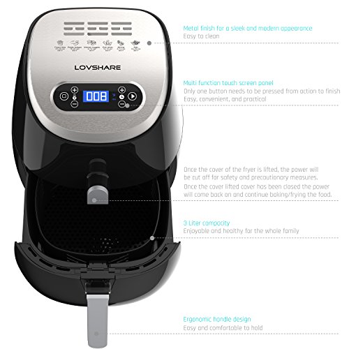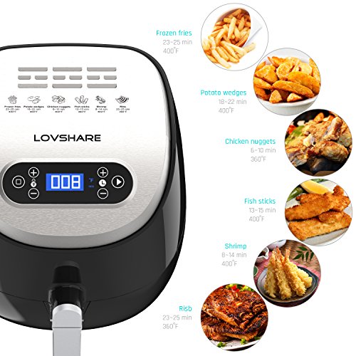 The LOVSHARE Air fryer low fat air fryer. Healthy way to fry using 80% less oil. Rapid air circulation system to fry food faster. 100% Satisfaction Guarantee your satisfaction is our priority, that's why we offer you 100% satisfaction guarantee. If you are not satisfied with your purchase within 60 days, you can return it with 100% money back gurantee. No hassles, no question asked. If your air fryer fails within one year, we will send you brand new replacement. 100% Risk Free.