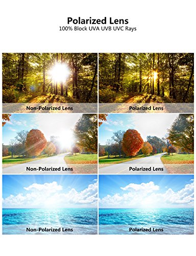 POLARIZED LENS: 100% UV400 protection coating, blocks 100% harmful UVA & UVB Rays. Restore true color, eliminate reflected light and scattered light,make the scenery more clear and soft and protect eyes perfectly. TAC lens includes 7 layers. The 1st layer is polarization layer. The 2nd and 3rd layers are bonding layers to enable durability. The 4th and 5th layers are UV protection layers to absorb UV light. The 6th and 7th layers are shatterproof layers.