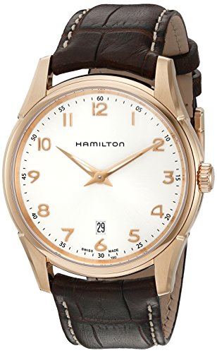 -. Binding : Watch -. Brand : Hamilton -. Department : mens -. EAN : 0758501652852 -. Feature : Rose gold- tone stainless steel case with a brown leather strap. Fixed bezel / Silver dial with rose gold-tone hands and Arabic numeral hour markers. Date display at the 6 o'clock position / Swiss-quartz Movement / Case Diameter: 42mm / Water Resistant To 50m (165ft: in General, Suitable for Short Periods Of Recreational Swimming, but not Diving or Snorkeling -. Label : Hamilton -. Manufacturer : Hamilton -. Model : H38541513 -. MPN : H38541513 -. PartNumber : H38541513 -. ProductGroup : Watch -. ProductTypeName : WATCH -. Publisher : Hamilton -. Studio : Hamilton -. Title : Hamilton Men's 'Jazzmaster' Swiss Quartz Gold and Leather Automatic Watch, Color:Brown (Model: H38541513) -. UPC : 758501652852