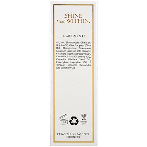 Other Ingredients: Organic simmondsia chinensis (jojoba oil), olea europaea (olive oil), pelargonium graveolens (geranium essential oil), organic passiflora incarnata (passionflower), cannabis sativa oil (hemp oil), camellia oleifera seed oil, calophyllum inophyllum (oil of tamanu), hippophae rhamnoides (sea buckthorn oil).