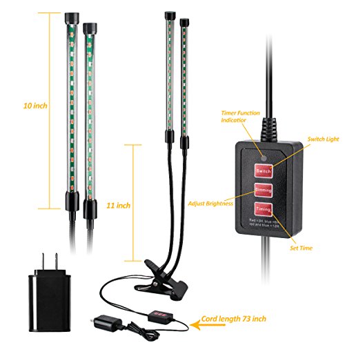 -. Feature : This plant growing light gives off targeted wavelengths (460nm and 660nm) lights which can be fully absorbed by plants to help accelerate the growth of indoor plants, potted plants, foliage plants, flowering plants, succulent plants. It can rapidly improve the health of plant and growing, generally leaves grooming within 2 weeks of using this growing lamp on a daily basis. / 36 Leds plant growing beads(24 red & 12 blue). Ultra bright, lower heat and lower power consumption, high luminous efficiency and long service life. Flexible Gooseneck. It is easy to adjust the light towards any directions if the plants need. / Adjustable & dimmable 5 levels with flexible gooseneck. You can adjust the brightness of the light and the distance between the light and plant according to plant needs. The flexible neck makes the light in any direction. / USB connector, you can choose to plug into a wall outlet or an USB interface. Compact design, strong metal clip, 3 ways to fix the clamp (Clip, Screw or Stick). It can be placed anywhere you want to put. Easy to install at your home or office. Can be widely used indoor with a wide variety of plats. Easy to install at your home or office. Especially for Office Desk Plants use, convenient to operate. / Timing Function : This is the latest timing function USB plug in grow light , you can not only set it up for lighting 3 hour / 6 hour / 12 hours, but also adjust the brightness of the light and the distance between the light and plant according to plant needs. Note: This is A ONE-WAY TIMER, user can set it up to turn off automatically after 3H/6H/12H, but have to turn it on manually.