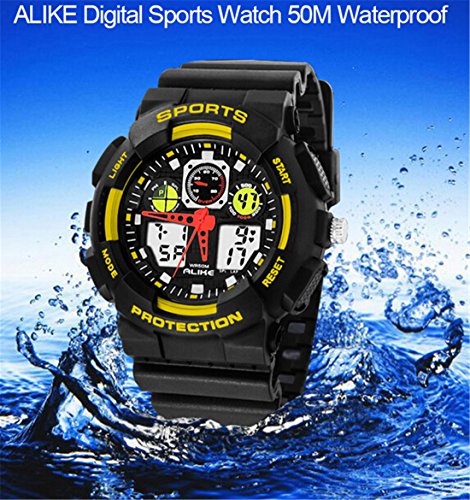 -. Feature : New Fashion LED Watches / Japanese High quality movement. Long Battery Life Display time in numbers indicate the hour, minutes and seconds, Display the day & date 12h/24h, Alarm clock function included, Stop watch function included . / 50 meters life waterproof. (Please Don't Press Any Key Underwater) / Best gift to your lover,Partner, family, friends, classmates, colleagues / To keep up with the fashion, this gracefully and enigmatic wrist watches would be your best choice