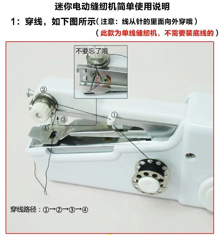 7.换线团:如换大线团,可将备用的接长杆与线筒轴连接,套入大线团.然后重新穿线,调整线的松紧后进行缝制.