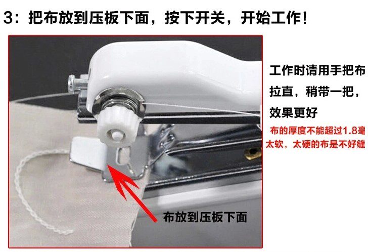 4.放布:用右手食指抬起压板,将准备好待缝的织物平整放入压板下,轻轻放回压板压住织物