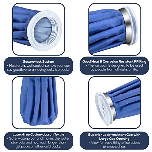 HIGH QUALITY – The ice bag is made of high quality latex – free Cotton-dacron Textile which is safe and waterproof, and makes the water stay cold and hot much longer. The top comes with a good heat and corrosion resistant PP ring and the secure lock system of the lid keeps the moisture well sealed. The bag comes with a superior leak resistant cap with a large opening. This allows easy filling of ice cubes or hot water. No drips, No Leaks!