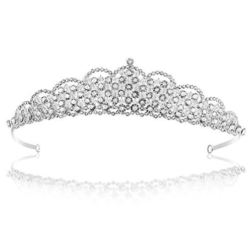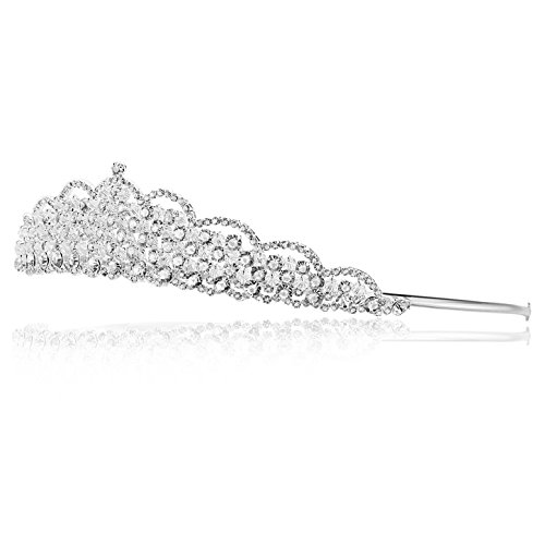 Made with rhinestone crystals and crystal beads in a silver plated metal setting. Measures approximately 1-3/8 inches tall at the center. Beautiful design measures 8-1/4 inches along the band. Pin loops at each end of the tiara for extra security. Fantastic hair accessories for weddings_ proms_ parties or other special occasions.