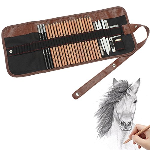 - What You Get --18pcs Sketch Pencils set (HB/1pcs, B/1pcs, 2H/2pcs, 2B/4pcs, 3B/2pcs, 4B/4pcs, 5B/1pc, 6B/1pc, 7B/1pc, 8B/1pc), 3 Charcoal Pencils(Soft, Neutral, Hard), 4B Eraser/1pcs, Kneadable eraser/1pcs, Craft Knife/1pcs, Pencil Extender/1pcs, Pencil Bag/1pcs, 29pcs in total