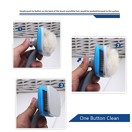 Features 1.Self-Cleaning Button: Simply press this button to start brushing your pets. After you're done, press the button again and the fur/dead hair will fall right off with a swipe of the finger.