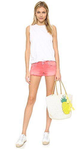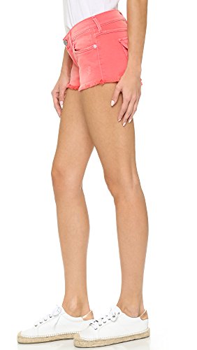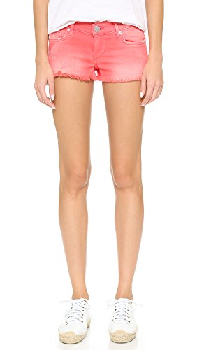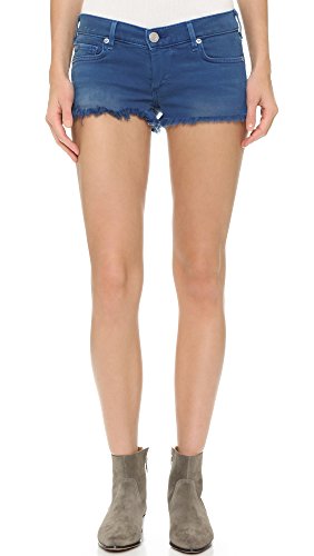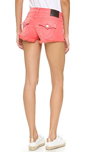 Low-rise True Religion cutoff shorts composed of colorful super-stretch denim. Light fading and frayed spots. 5-pocket styling. Button closure and zip fly.
