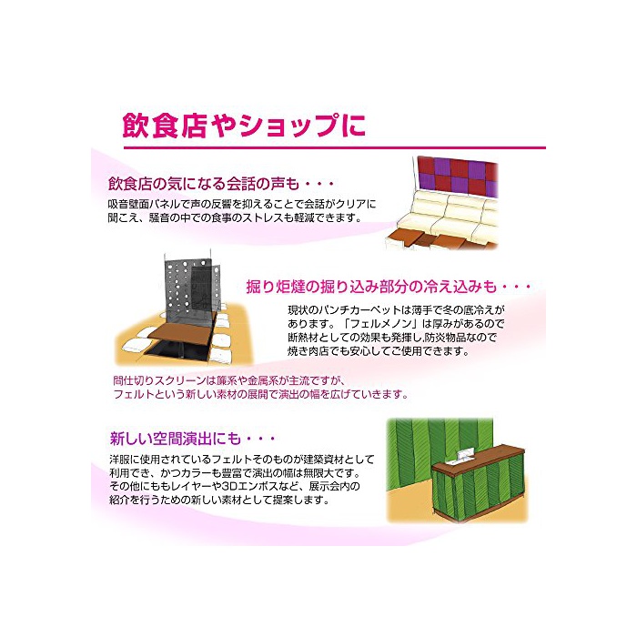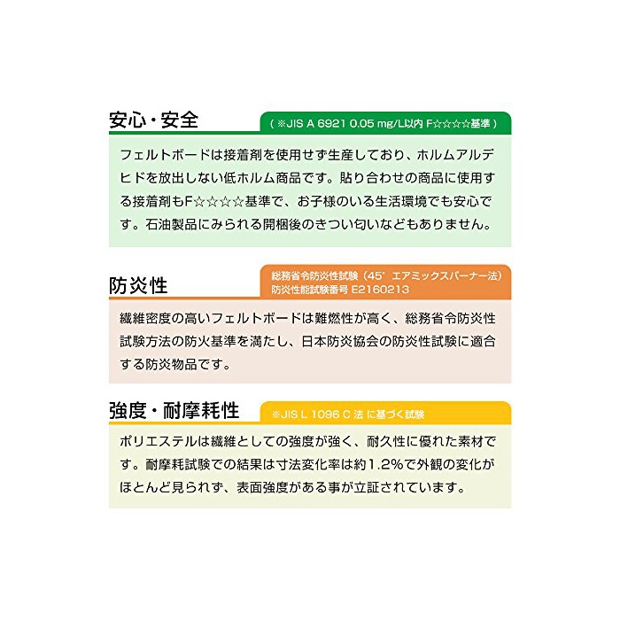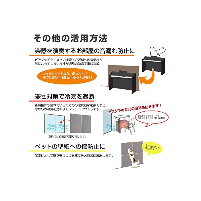 ※아이의 생활 소음의 문제:한창 클 때의 아이 들은,돌아다니거나 큰소리를 나와 하거나가 일상다반사.마루나 벽면에 펠트 보드를 사용 하면 건강한 아드님의 발소리의 경감이나 방 전체의 흡음효과도 발휘합니다.