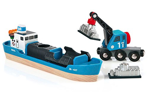 -. Feature : BRIO container ship and crane wagon including 2 magnetic loads / Freight ship featuring flip up cargo hold to securely store loads / Crane wagon featuring rotating crane and real lift action / Fully compatible with all BRIO wooden railway sets / For ages 3+