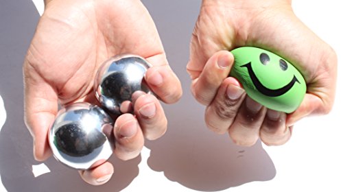 Hold 2 with 1 Iron Ball on hand and rotate in your palm! It also practicing your brain if you play the iron ball and the squeeze ball all together...