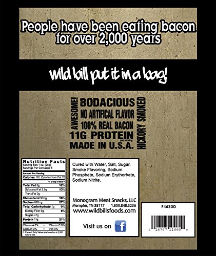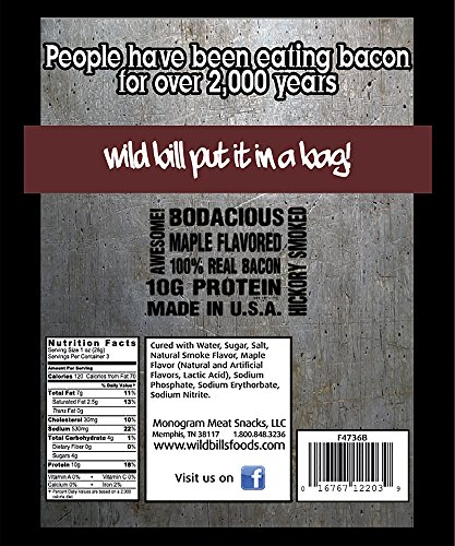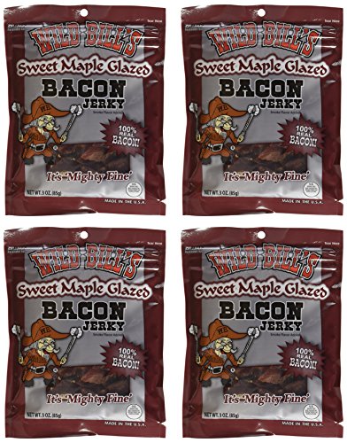 -. Feature : Wild Bill's Bacon Jerky - Available in Hickory and Sweet Maple Glazed / If you're a bacon lover, you'll love this jerky - it's meaty, salty, and smoky / Thick bite size pieces of 100% real bacon jerky / Proudly made in the USA - USDA inspected and approved / The perfect low carb snack - zero carbs per 1oz serving