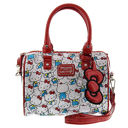 VINTAGE HELLO KITTY SHINY PATENT FAUX LEATHER BAG WITH EMBOSSED DETAIL. COMES WITH ADJUSTABLE SHOULDER STRAP. MEASUREMENTS: W: 10" X H: 7.5" X D: 7"