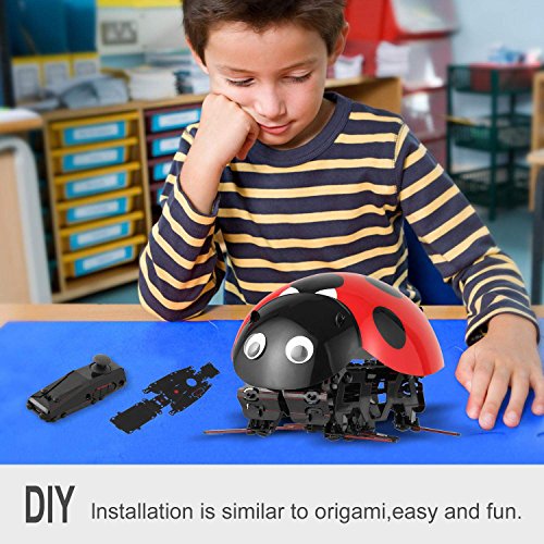 -. Feature : Ladybug DIY robot kits for kids, made of durable new composite materials, assembled as simple as a folding paper / Walk in all directions- forward, backward, left and right arms can sway up and down. Can run in all kinds of complex terrain sand, gravel, ice, grass, etc / 3 different control mode. Remote control Mode / Collision perception mode / Autonomous mode of activity. Control by joystick, more accurate and faster reaction. With rechargeable li-on battery, up to 30 minutes play time / The mechanical structure derives from the principle of insects? rapid movement. Original new composite materials, durable, lightweight, can be fold around / USB charging, can charge through Computer, Power Adaper, Power Bank or Car Charger, Perceived touch independent analysis and action, like real insect. Clever movement structure design, Through the leg movement to achieve running