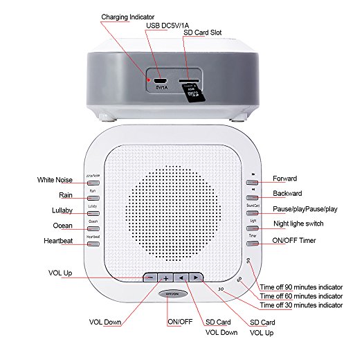 Package includes: 1 x White Noise Machine 1 x Adapter 1 x USB Charging Cable 1 x SD Card(1G) 1 x Manual 0