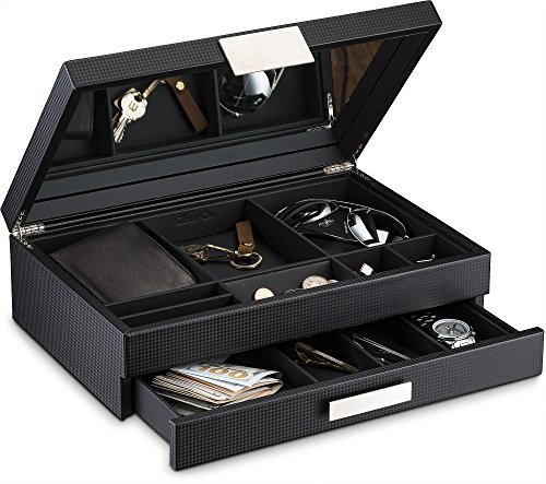 Glenor Co Mens Valet / Dresser Organizer - 12 Slot Luxury Jewelry Accessories Box, Carbon Fiber Design, Drawer Tray, Metal Buckle & Large Mirror for Men’s Watches, Sunglasses, Wallet… Pu Leather Black