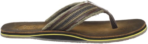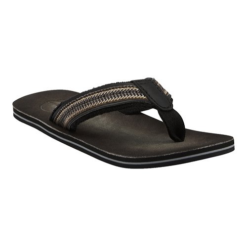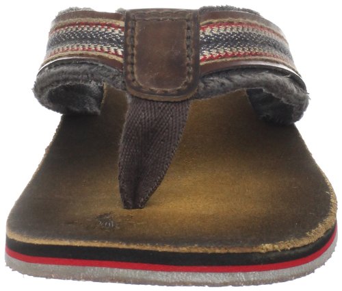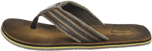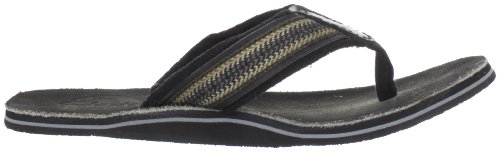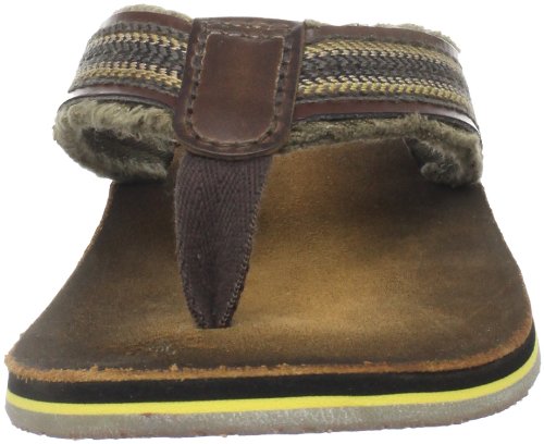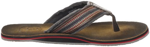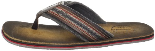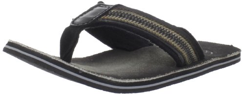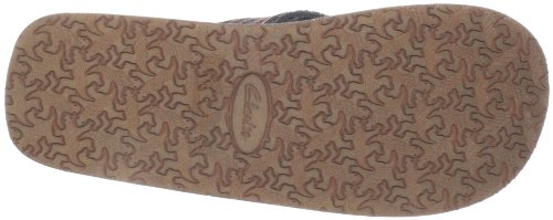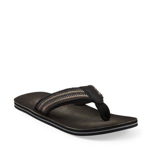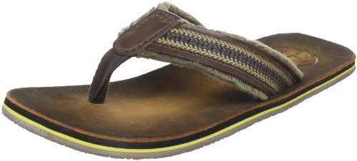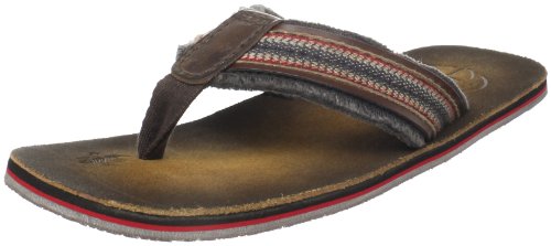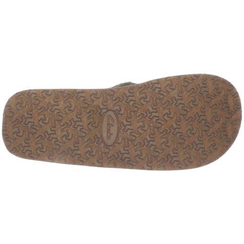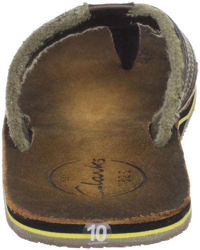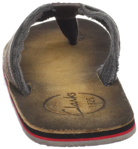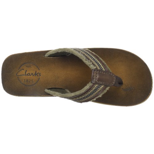 Amazon.com Product Description Your summer fun awaits in this beach-ready men's Cayo thong sandal by Clarks. A cool, comfortable and yes, even classy foundation to swim gear, cutoffs and cargos, the relaxed sandal pairs the luxury of leather with subtly printed fabric for a classic spin on warm-weather footwear. We're digging its naturally contoured insole and rubber traction base that let you navigate sand, rock and seashore in safety, and you'll appreciate how effortlessly its laid-back outlook transitions from Frisbee tossing with the family dog to a night on the town with friends. 0