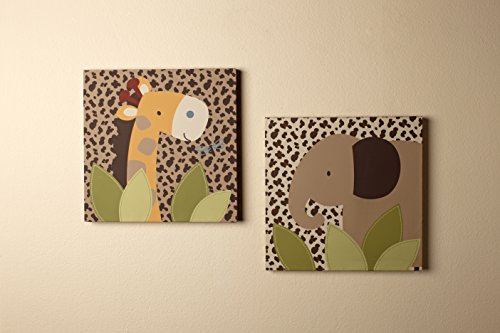 NoJo - Kulala Wall Decor - 2pc Canvas Art features some of our favorite jungle friends Elephant and Giraffe, each accented with a mix of animal prints in colors of ivory, tan, sage, green and marigold. Each piece of art measures 10" x 10". Comes ready to hang and coordinates with a full line of nursery bedding and decor.