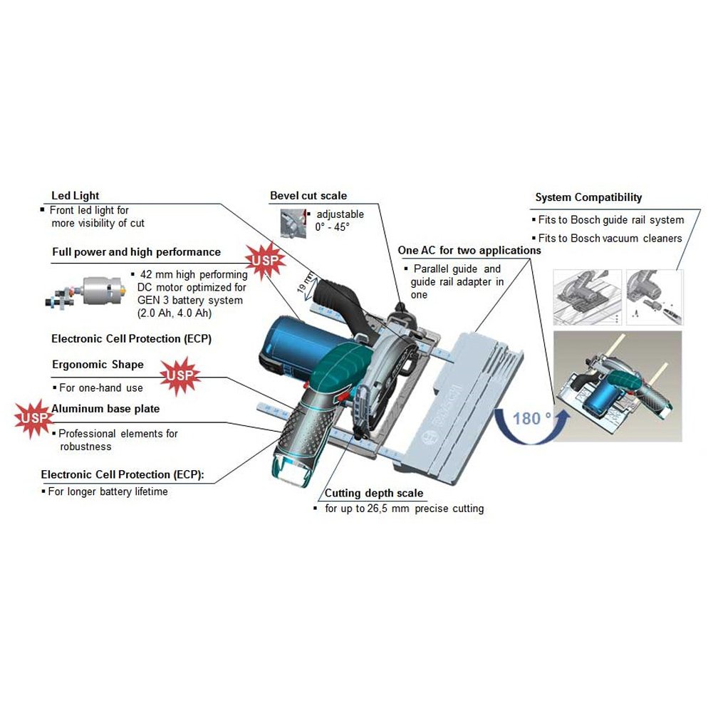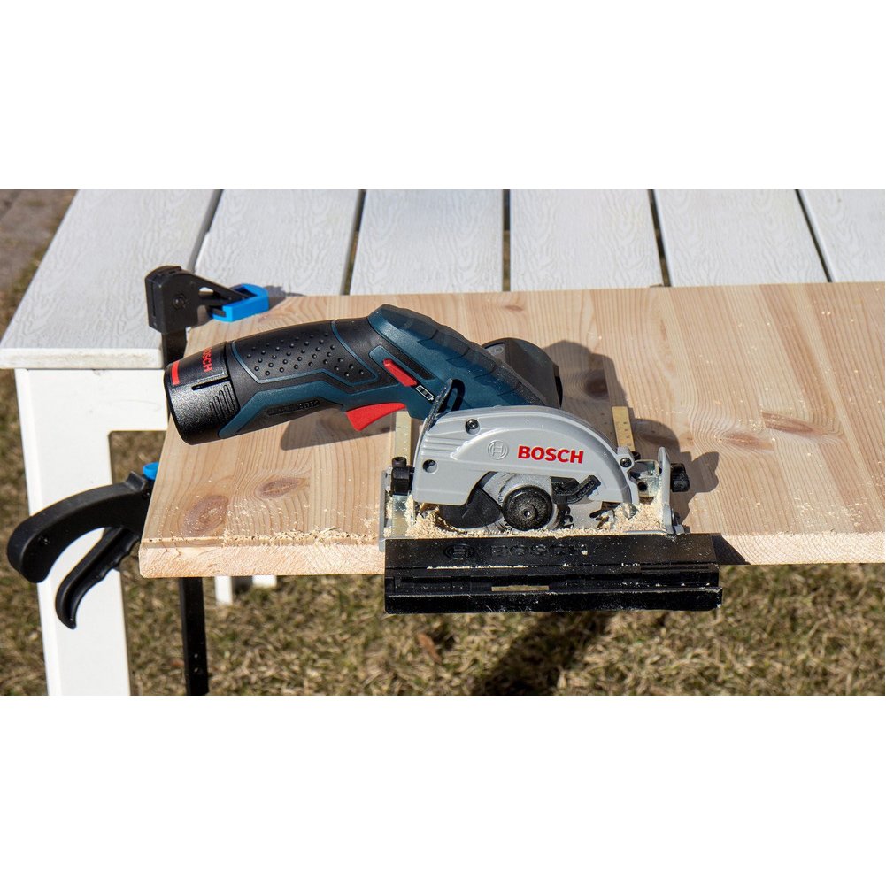 Perfect for cutting laminate flooring and similar, this compact circular saw gives a powerful cut in wood up to maximum depth of 26.5mm at 90° and 17mm at 45°. |