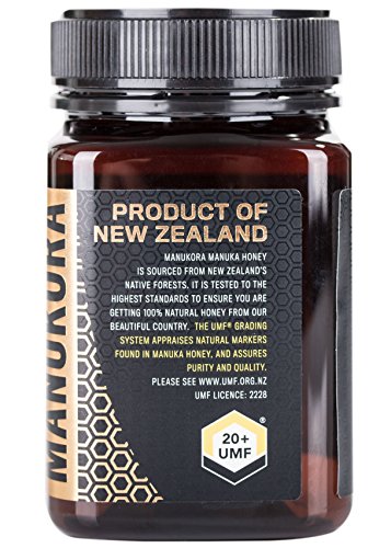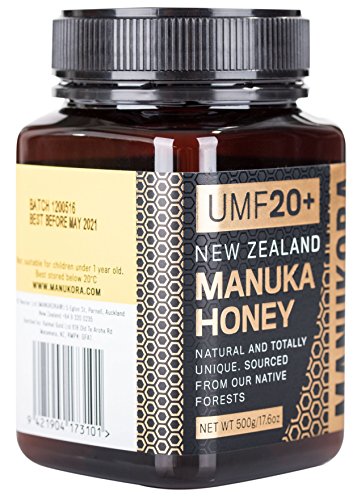 -. Feature : UMF 20+ certified Manuka Honey produced in most pristine environments of New Zealand's native forests. Lab-certified to be UMF 20+ standard, equivalent to methylgloxal (MGO) 825+ / Batch-tested in independent labs for UMF certification / Whipped and packed straight from the hive / Delicate creaming process makes Manukora honey smooth, luscious and delicious / For manuka honey to receive a UMF grading, independent lab test results must show the presence of DHA (dihydroxyacetone), Methylglyoxal, and Leptosperin. Manukora works with a trusted network of beekeepers around New Zealand