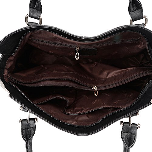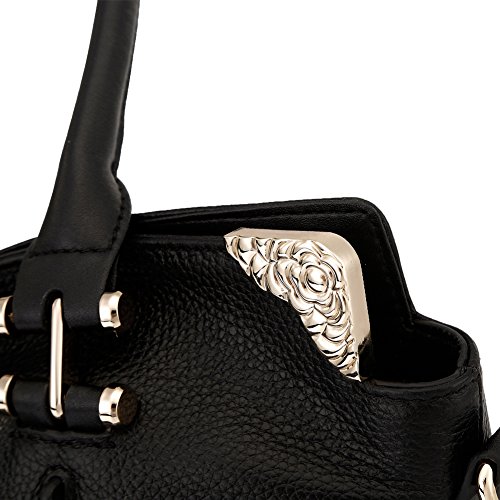 -. Feature : GENUINE LEATHER - Premium geniune cowhide leather with soft and comfortable feeling. Polyester silk lining and quality shiny hardware can stay in good condition even if used for a long time. / EMBOSSMENT DESIGN - The opening of this concise shoulder bag is embossed with a design of flowers hardware, noble as well as elegant. / DIMENSIONS - Measures about 13.2" L x 6.1" W x 10.2" H, handle about 7.1" long. Easily hold you books, iPad, phone, umbrella, wallet, cosmetics and other stuff. / STRUCTURE - Comes with 2 large capacity main compartments, 1 zipper compartment, 1 side zipper pocket, 1 phone pocket, 1 card pocket and 1 back zipper pocket, meeting your daily needs. / IDEAL FOR ANY OCCASION - Perfect for dating, office, shopping, travel, party, banquet or special events. Also can be an ideal gift for yourself or for that someone special.