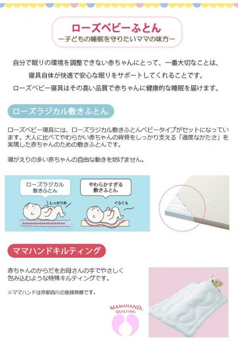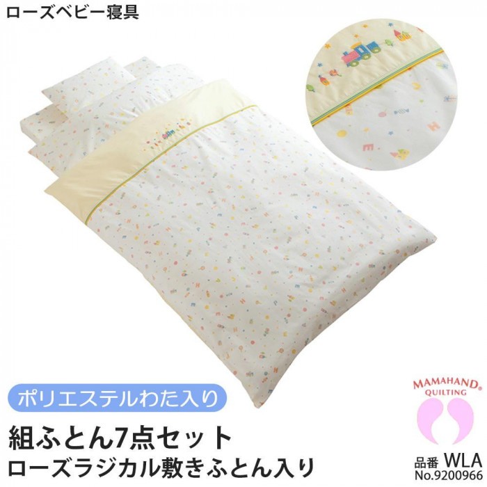 | 汽車やおうち、アルファベットが散りばめられた絵柄の組ふとん7点セット。赤ちゃんの体を包み込むママハンドキルティングを施した掛けふとんと、赤ちゃんの背骨をしっかり支えるローズラジカル敷きふとんで、赤ちゃんの快適な眠りをサポートします。 |