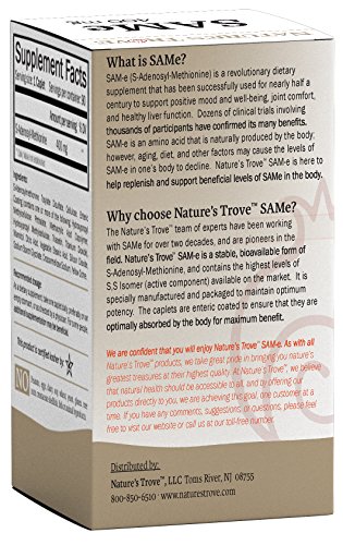 We are confident that you will enjoy Nature's TroveTM SAM-e. As with all Nature's TroveTM products, we take great pride in bringing you nature's greatest treasures at their highest quality. At Nature's TroveTM, we believe that natural health should be accessible to all, and by offering our products directly to you, we are achieving this goal, one customer at a time. If you have any comments, suggestions, or questions, please feel free to visit our website or call us at our toll-free number. Recommended dosage: As a dietary supplement, take one caplet daily, preferably on an empty stomach, or as directed by a physician. For some people, additional supplementation may be beneficial. *These statements have not been evaluated by the Food and Drug Administration. This product is not intended to diagnose, treat, cure, or prevent any disease. 0