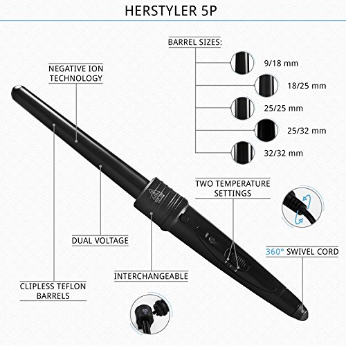 The Herstyler 5 in 1 Curling Wand Set has everything a girl could need to complete any look. With five clipless attachments, you're sure to the find the one you need to get any sized perfectly formed, bouncy, loose curls that will hold all day, whether your hair is coarse and thick or poker straight.