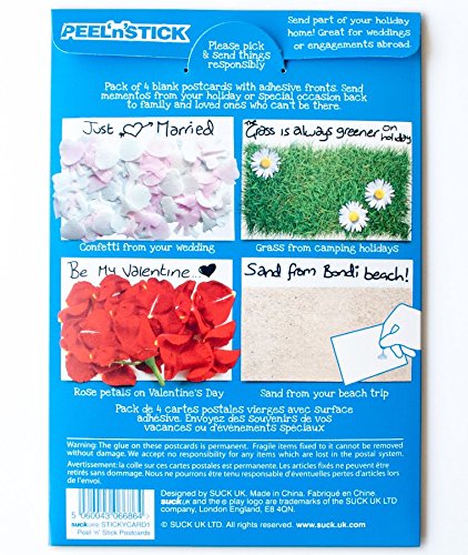 -. Binding : Office Product -. Brand : Suck UK -. EAN : 5060043066864 -. Feature : Adhesive front to attach almost everything! / 4 postcards per pack / Rose petals for valentines day, beach sand from that summer holiday or your favourite snaps for a best friends birthday! / Personalise your cards and messages to your loved ones and friends / Each postcard measures 15.2 x 0.1 x 10.2 cm -. IsAutographed : 0 -. IsMemorabilia : 0 -. Label : Suck UK - Office Products -. Manufacturer : Suck UK - Office Products -. Model : SK STICKYCARD1 -. MPN : SK STICKYCARD1 -. NumberOfItems : 1 -. PackageQuantity : 4 -. PartNumber : SK STICKYCARD1 -. ProductGroup : Office Product -. ProductTypeName : PAPER_PRODUCT -. PublicationDate : 2011-11-30 -. Publisher : Suck UK - Office Products -. Studio : Suck UK - Office Products -. Title : SUCK UK Peel and Stick Adhesive Postcard