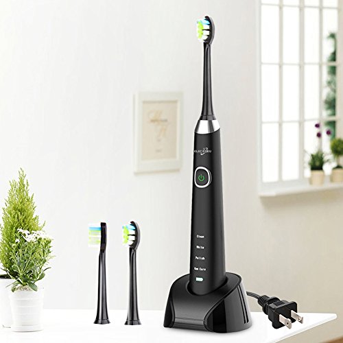 ELECTRIC TOOTHBRUSH RECHARGEABLE SONIC TOOTHBRUSH WITH WIRELESS CHARGING BASE AND 4 BRUSHING MODES AND 2 REPLACEMENT HEADS WATERPROOF IPX7 BY ELECFORU (BLACK)