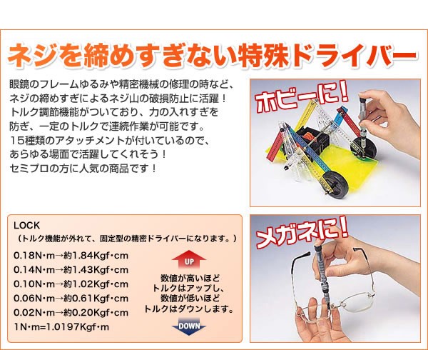 | セット内容 | プラスビット×3(NO.00-NO.0-NO.1) マイナスビット×4(1.5-2.0-2.5-3.0mm) ヘックスビット×4(0.71-0.89-1.27-1.5mm) ヘックススローブ×3(T5-T6-T8穴付き) フチナシメガネ用×1(2.5~2.6mm/2.2~2.4mm) |