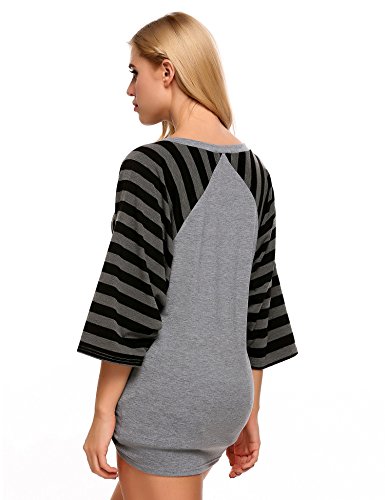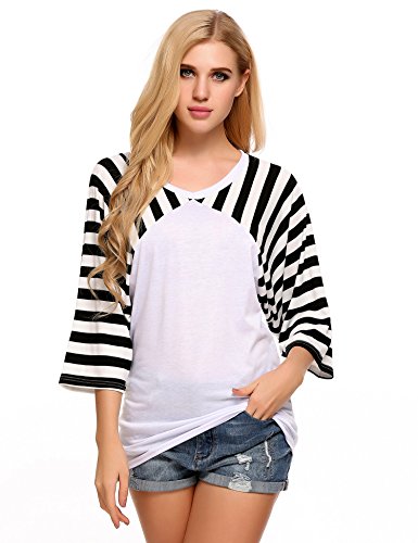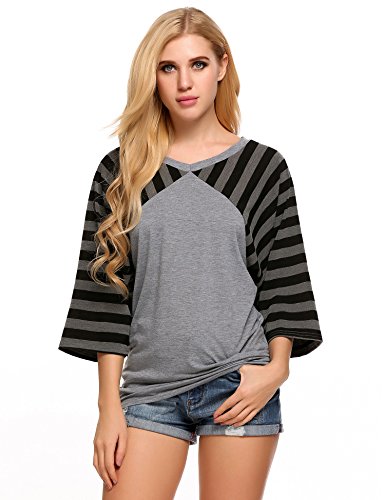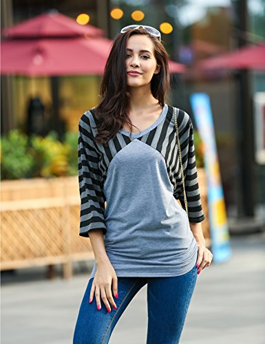 Casual top features: scoop neck, 3/4 sleeve, striped patchwork, unique style.