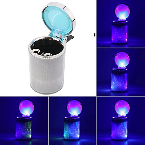 -. Feature : Fit Most Car Cup Holder - Height: Size (H*D):3.94" x 2.68" / Not Only an Ashtray - It also Can be Used as a Handy Coin/Change Holder or Small Stuff Trash Can / Humanized Design - the Colorful LED Lights will Automatically Light Up at Night, Once Fully Open Cover, Battery Storage in the Back of the Lid / No Smells Remain - Wrapped with Classy Shell, Keep your Vehicle or Room From Smelling Like an Ashtray, Reduce Secondhand Smoke / Much Durable - Made of Quality Flame-Retardant PBT Which Can Bear Temperature 220 Celsius Degrees