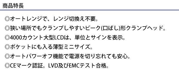 フルオートレンジ(40A/300Aの2レンジオート)です。4000カウント大型LCDは、単位とサインを表示します。ポケットにも入る薄型ミニサイズなので持ち運びに便利!オートパワーオフ機能で電源を切り忘れても安心。 |