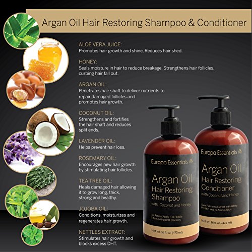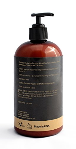 Europa Essentials Hair Growth Stimulating DHT Blocker Shampoo is a gentle, hydrating formula safe for daily use on all hair types. Fresh scent is suitable for both women and men. Contains no parabens. Made from USDA certified organic ingredients and natural ingredients. Vegan, cruelty-free, not tested on animals. We put careful consideration into choosing the highest quality, most effective ingredients nature has to offer to stimulate hair growth and prevent future hair loss. Made with a blend of 19 amino acids, 15 follicle stimulating DHT blockers, and ingredients known as biotin carriers. Invigorate your scalp and bring life back to your hair follicles. Brighten dull, lifeless hair and add moisture, softness and shine from roots to ends with Europa Essentials Argan Oil Hair Restoring Shampoo. For best results, follow with Argan Oil Hair Restoring Conditioner.