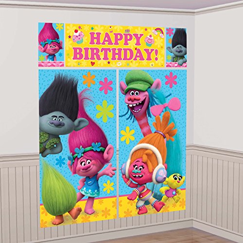 Studio : AMSCAN Publisher : AMSCAN Binding : Toy Product Description TROLLS The Movie Scene Setter Photo Backdrop Poster ransform plain walls into a Trolls scene with a Trolls Scene Setter! This Trolls wall decoration features two big posters that include Poppy, Branch, Cooper, and DJ Suki with prints of flowers in the background. A big "Happy Birthday" headline is printed at the top to wish the birthday boy or birthday girl a special day. Display these Trolls posters indoors or outdoora as a Trolls party wall decoration that doubles as a photo backdrop! Measures 65in x 75in when assembled. Trolls Scene Setter includes: Banner, 44in wide x 16in tall 2 large posters, 32 1/2in wide x 59in tall 2 small posters, 10in wide x 16in tall 0