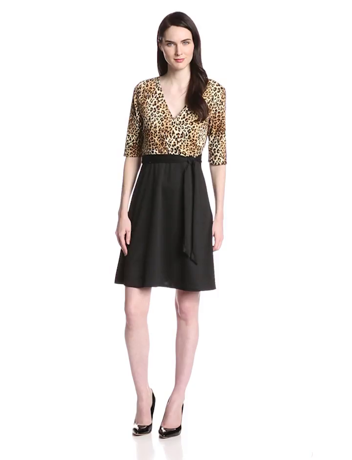 Product Description3/4 sleeve faux wrap dress with print top and solid skirt0