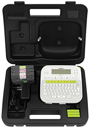 Carrying case holds one P-touch labeling machine, a variety of tape cassettes, batteries and an AC adapter. Each item is sold separately. The product is manufactured in China.