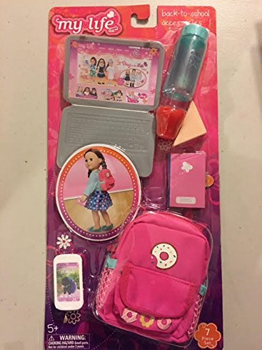 Back to School accessories for My Life As 18" dolls. Includes pretend play items :Water bottle, Laptop, Apple, Sandwich, Notebook, Smartphone, and Backpack. Doll not included.