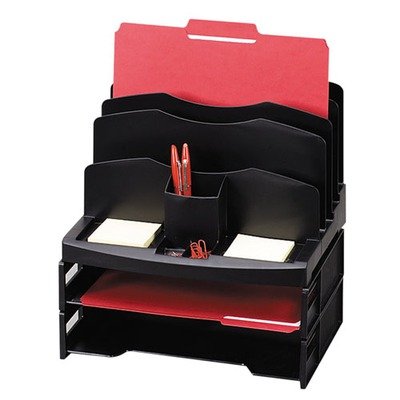 -. Feature : Black plastic Smart Sorter(TM) system features four tiered vertical sections above, a supply organizer in front and two stacking letter-size trays underneath. / Four tiered vertical sections for documents, file folders. / Supply organizer in front stores paper clips, rubber band, pens and more. / Two stacking trays for letter size materials underneath. / Black plastic Smart Sorter system features four tiered vertical sections above Black plastic Smart Sorter system Measuring: 10 x 12 1/4 x 13 inches / Black plastic Smart Sorter system features four tiered vertical sections above / Black plastic Smart Sorter system / Measuring: 10 x 12 1/4 x 13 inches