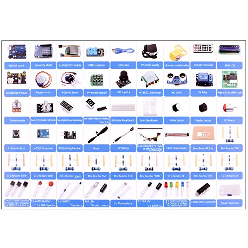 Has all the arduino products you need in Nice package with clear listing , such as 9V 1A Power Supply lcd display Ultrasonic Sensor Module shield SG90 motor Ultrasonic Sensor Module wire,LED, IC,buttons,diodes ,etc.All the modules come soldered so they are easy to wire up.