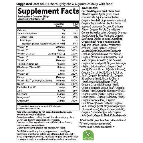 WOMEN-SPECIFIC: This gummy multivitamin for women has targeted ingredients to support the needs of women over 40 including organic Black Cohosh, organic Pacran whole food cranberry and 800IU Vegan D3 vitamin