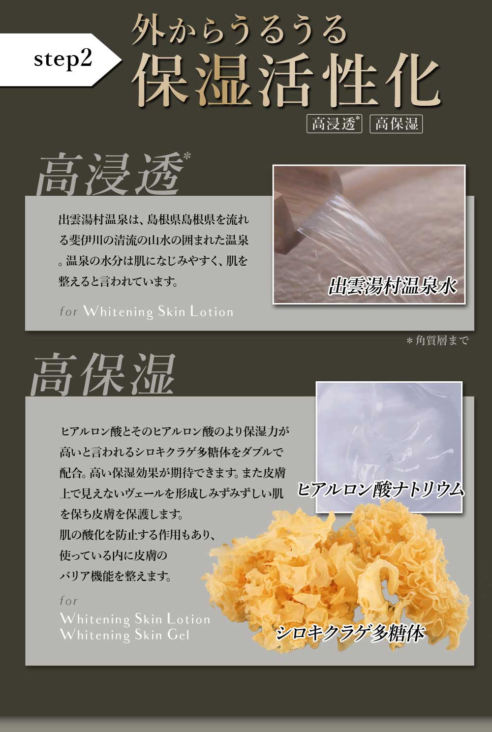 | 【その他の成分】 | ヒアルロン酸ナトリウム(2)、シロキクラゲ多糖体、シクロヘキサンジカルボン酸ビスエトキシジグリコール、出雲湯村温泉水、1,3-ブチレングリコール、フェノキシエタノール、トリメチルグリシン、1,2-ペンタンジオール、グリセリン、サクラ葉抽出液、オウゴンエキス、カモミラエキス(1)、ダイズエキス、乳酸ナトリウム液、1,2-ヘキサンジオール、クエン酸、エデト酸二ナトリウム、精製水 |