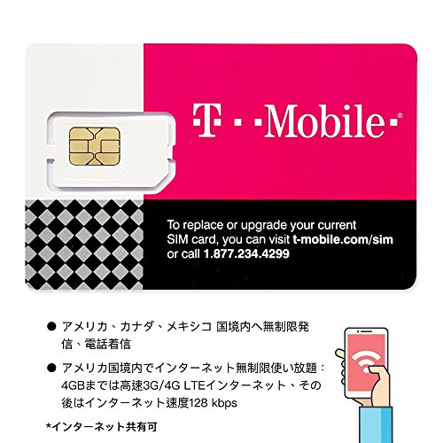 -. Feature : 当プランはアメリカでしかご利用いただけません。(カナダ、メキシコではご利用いただけません。ご留意ください。)4GBまでは高速3G/4G LTEインターネット、その後は低速(128 kbps)で無制限使い放題。アメリカ国内で30日間通話、データ通信し放題です。 / SIMカードは3-in-1仕様、全サイズ(標準、Micro、Nano)対応。 / 対応携帯電話端末:1.SIMロックフリー端末また 2.SIMフリー携帯電話GSM(850/1900Mhz)→通話・テキスト・3. 3Gデータ対応 Band 2 /1900Mhz, 4.4G、LTE対応:Band2/1900MHz ,Band4 1700/2100NHz, Band12/700MHz / 【日本語説明書付き】商品到着後、2018/04/30までにインターネットにてカードの登録をお行いください。開通作業は商品同梱の説明書に従って、開通サイトにアクセスして情報入力するだけです。 / お知らせ: T-Mobile USは、3G(WCDMA1900)の帯域に使用する基地局をLTE(Band2)に割り当てることによってLTE対応エリアが従来より幅広くなり、3G(WCDMA1900)と2G(GSM1900)のサービスエリアを減らしていきます。LTE band 2 に対応するスマホは、サービスエリアでよりスムーズにLTE高速インターネット通信が利用できますが、LTE非対応端末は特定地域で2G(GSM1900)しか使用出来ません。全てのSIMサイズ(標準、Micro、Nano)に対応しています。SIMフリーの携帯のみ適用されます。SIMロック解除の手続きは(https://ctsim.jp/simunlock/)でご参考ください。