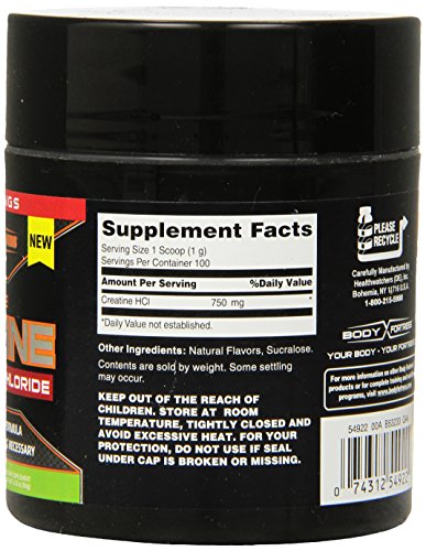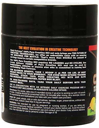 -. Binding : Health and Beauty -. Brand : Body Fortress -. EAN : 0074312549229 -. Feature : Provides 750 mg of Creatine HCl per scoop / The next generation of Creatine / A vegetarian-friendly choice for athletes and bodybuilders / Naturally flavored Lemon Lime powder / Packaging may vary due to new packaging updates, same great product -. IsAdultProduct : 0 -. Label : Body Fortress -. Manufacturer : Body Fortress -. Model : 0 -. MPN : 0 -. NumberOfItems : 1 -. PackageQuantity : 1 -. PartNumber : 0 -. ProductGroup : Health and Beauty -. ProductTypeName : HEALTH_PERSONAL_CARE -. PublicationDate : 2015-01-22 -. Publisher : Body Fortress -. ReleaseDate : 2015-02-10 -. Studio : Body Fortress -. Title : Body Fortress 100% Pure Creatine HCL, Lemon Lime, 100 Gram -. UPC : 074312549229