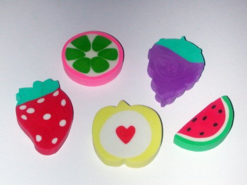 Product Description These fruit erasers make correcting mistakes a refreshing experience. The variety includes strawberries, watermelon, apples and more. 0