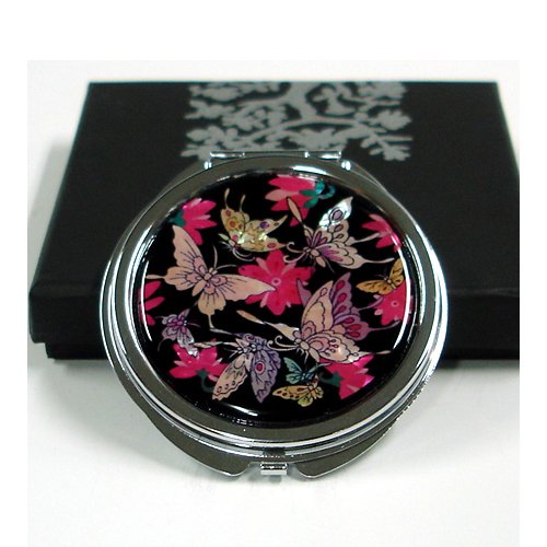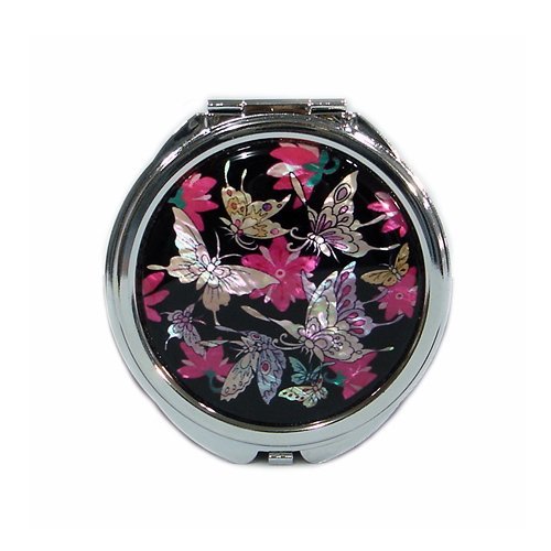 Mother of Pearl Butterfly Design Red Black Double Compact Cosmetic Makeup Personal Handbag Mirror, 3.2 Ounce